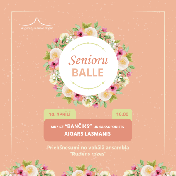 10. aprīlī plkst. 16.00 Ventspils Kultūras centrā, pēc ilgākas pauzes, atkal notiks Senioru balle. Svētdienas pievakari seniori varēs pavadīt lieliskā kompānijā un izdejoties dzīvās mūzikas pavadījumā.