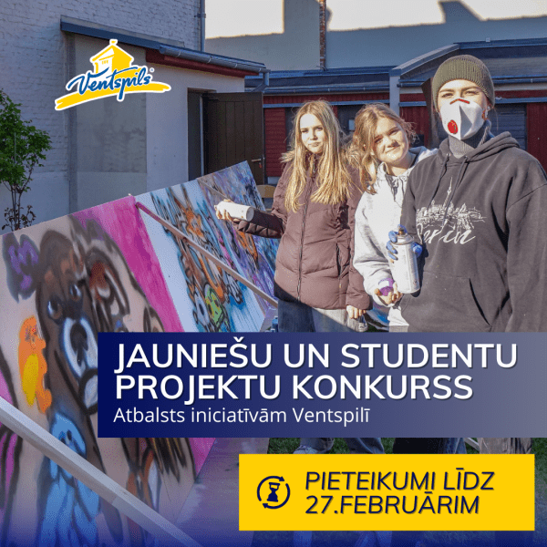 Ventspils Kultūras centrs izsludina Ventspils valstspilsētas jauniešu brīvā laika pavadīšanas un aktīvās atpūtas veicināšanas projektu finansēšanas konkursu, kā arī tā apakšprogrammu “Atbalsts Ventspils Augstskolas studentiem un studentu organizācijām”. Konkurss paredzēts iniciatīvām, kas sekmē jauniešu iesaisti aktīvās, izglītojošās un kultūras norisēs Ventspils pilsētā.