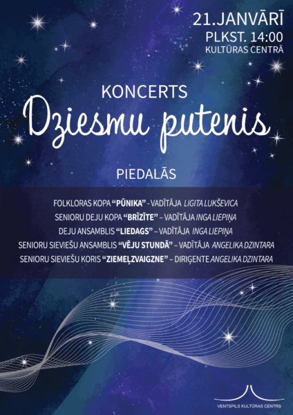 Sestdien, 21. janvārī plkst. 14:00 Ventspils Kultūras centrs aicina uz koncertu “Dziesmu putenis”, kurā piedalīsies senioru sieviešu koris “Ziemeļzvaigzne” (diriģente Angelika Dzintara), senioru sieviešu ansamblis “Vēju stundā” (vadītāja Angelika Dzintara), folkloras kopa “Pūnika” (vadītāja Ligita Lukševica), senioru deju kopa “Brīzīte” un deju ansamblis “Liedags” (vadītāja Inga Liepiņa).
