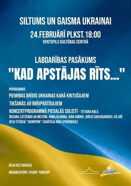 Aicinām Ventspils pilsētas iedzīvotājus un viesus apmeklēt labdarības pasākumu “KAD APSTĀJAS RĪTS…”, kas notiks 24. februārī plkst. 18.00 Ventspils Kultūras centrā.
