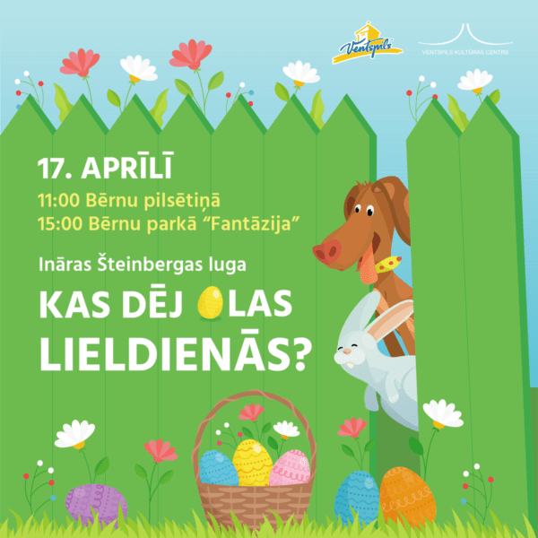 Pirmajās Lieldienās, 17. aprīlī plkst. 11.00 Bērnu pilsētiņā un plkst. 15.00 bērnu parkā “Fantāzija” Ventspils jaunieši mazajiem skatītājiem rādīs Ināras Šteinbergas lugu “Kas dēj olas Lieldienās?”.