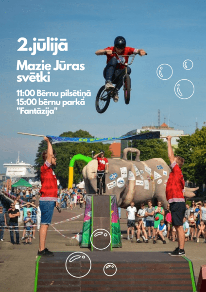 2.jūlijā plkst. 11.00 Bērnu pilsētiņā un plkst. 15.00 bērnu parkā “Fantāzija” pasākumā “Ar velo uz jūru” būs iespēja baudīt “Greentrials” velo šovu, piedalīties meistarklasē un izmēģināt Mini BMX velosipēdus.