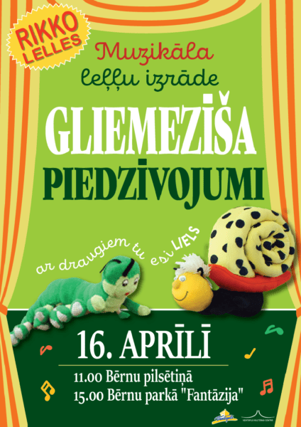 16. aprīlī plkst. 11.00 Bērnu pilsētiņā un plkst. 15.00 bērnu parkā “Fantāzija” aicinām uz muzikālu leļļu izrādi “Gliemezīša piedzīvojumi”. Mazie un lielie skatītāji tiks iesaistīti izrādes darbībā un piedzīvos aizraujošu piedzīvojumu kopā ar Gliemezīti un viņa draugiem.