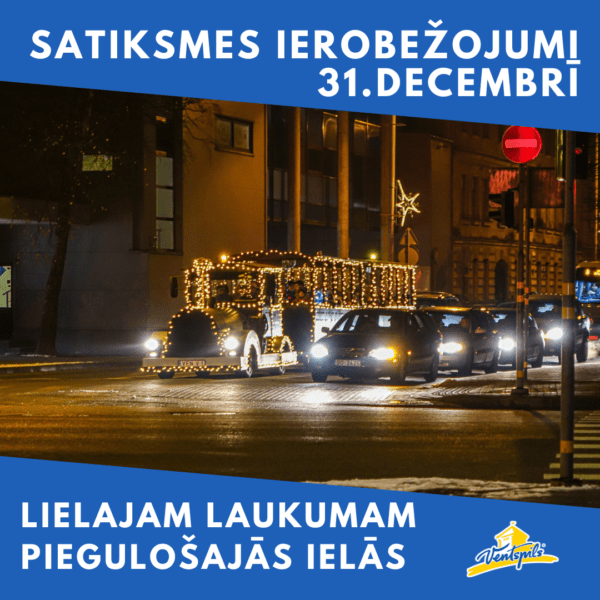Informējam, ka 31. decembrī Ventspilī Lielajā laukumā notiks Jaunā gada sagaidīšanas pasākums, kura nodrošināšanai no plkst. 23.30 līdz 1. janvāra plkst. 01.30 tiks slēgta transporta kustība sekojošās laukumam piegulošās ielās: