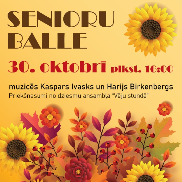 Mēneša izskaņā, 30. oktobrī plkst. 16.00 Ventspils Kultūras centrs aicina seniorus uz balli, kurā garantēts labi pavadīts laiks un izdejošanās dzīvās mūzikas pavadījumā.