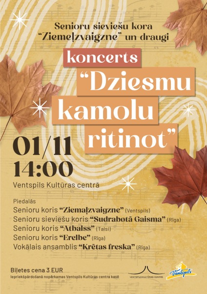 1. novembrī plkst. 14.00 Ventspils Kultūras centrā notiks senioru koru sadraudzības koncerts “Dziesmu kamolu ritinot”, kurā uz vienas skatuves satiksies dziedošie kolektīvi no dažādām Latvijas pilsētām. Pasākums solās būt ne vien muzikāls baudījums, bet arī sirsnīgs kopābūšanas un draudzības apliecinājums.