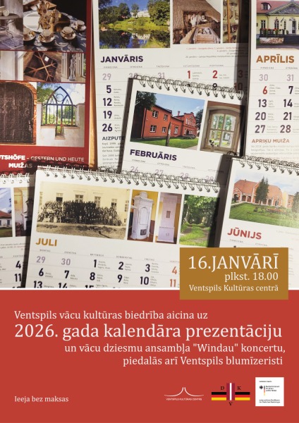 16. janvārī plkst. 18.00 Ventspils Kultūras centrā notiks Ventspils Vācu kultūras biedrības organizēta 2026. gada kalendāra “Lebendige Gutshöfe gestern und heute. Muižas vakar un šodien” prezentācija.