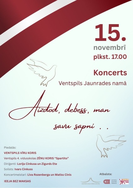 Sestdien, 15. novembrī plkst. 17.00 Ventspils Jaunrades namā notiks koncerts “Aizdod, debess, man savu sapni…”, kurā tiks godināta Latvijas neatkarība. Ar Andreja Eglīša vārdiem sirdīs un balsīs vienosies Ventspils vīru koris un Ventspils 4. vidusskolas zēnu koris “Spartito”, lai pieminētu to, kas katram latvietim ir īpaši svarīgs – savu valsti un tās brīvību.