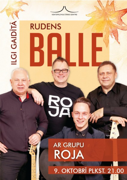 Ventspils Kultūras centrs 9.oktobrī, plkst. 21.00 aicina uz Rudens balli. Visa vakara garumā par lielisku atmosfēru un apmeklētāju dejotprieku gādās Latvijā iemīļotā grupa “Roja”.