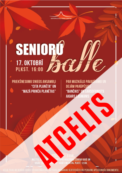 17.oktobrī, plkst. 16.00 Ventspils Kultūras centrā atsākies iecienītās Senioru balles. Seniori atkal varēs baudīt svētdienas pēcpusdienas lieliskā kompānijā un dzīvās mūzikas pavadījumā.