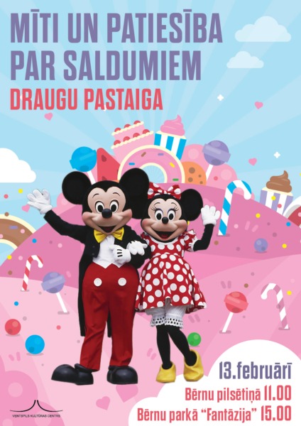 Svētdien, 13.februārī plkst. 11.00 Bērnu pilsētiņā un plkst. 15.00 bērnu parkā “Fantāzija” pastaigāsies sunītis Gūfijs, pelītes Mikijs un Minnija, lai ieelpotu svaigu gaisu un priecātos par savu ilgo un saldo draudzību.