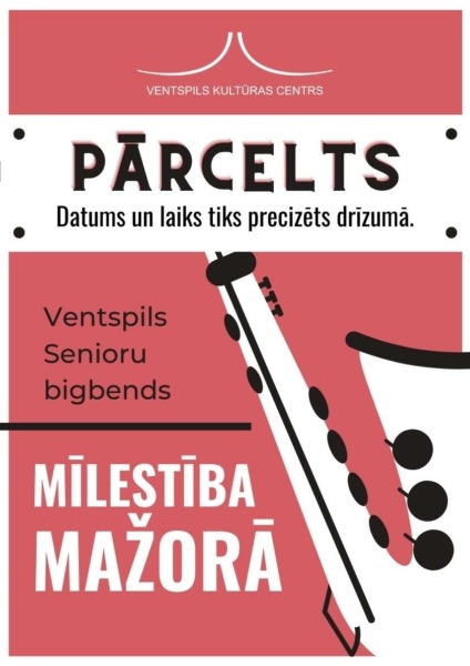 Informējam, ka tiek pārcelts 13. februārī paredzētais Ventspils Senioru bigbenda koncerts “Mīlestība mažorā” Ventspils Kultūras centrā. Datums un laiks tiks precizēts drīzumā.