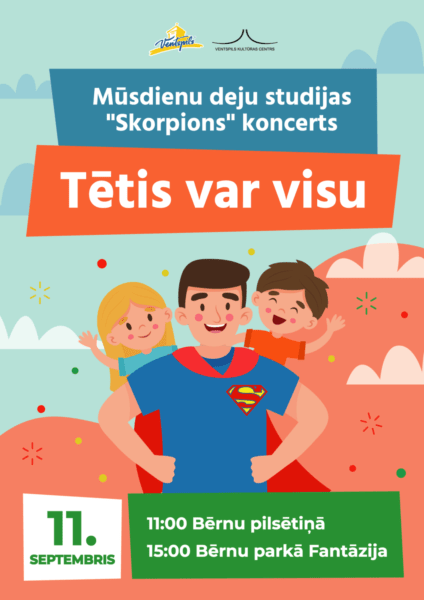 Svētdien, 11. septembrī plkst. 11.00 Bērnu pilsētiņā un plkst. 15.00 bērnu parkā “Fantāzija” aicinām uz sirsnīgu Tēva dienas koncertu “Tētis var visu”, kurā uzstāsies mūsdienu deju studija “Skorpions”, būs dažādas izklaides, kā arī pārsteiguma balviņas.