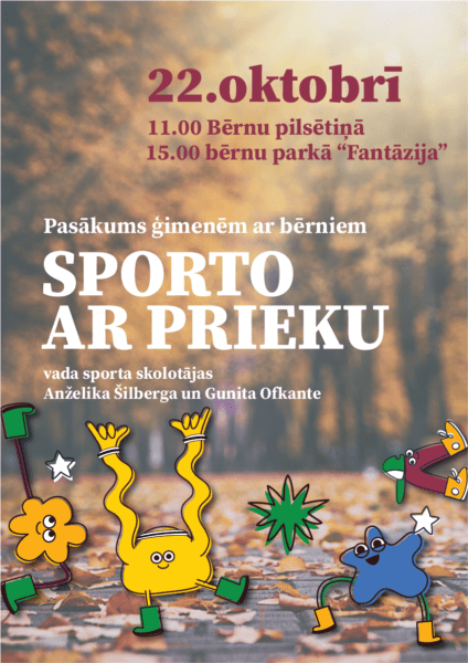 22. oktobrī plkst. 11.00 bērnu pilsētiņā un plkst. 15.00 Bērnu parkā “Fantāzija” Ventspils 2. pamatskolas sporta skolotāja Anželika Šilberga un Ventspils 4. vidusskolas sporta skolotāja Gunita Ofkante aicina visus rudens brīvlaikā būt aktīviem un piedalīties ģimeniskā un sportiskā pasākumā.