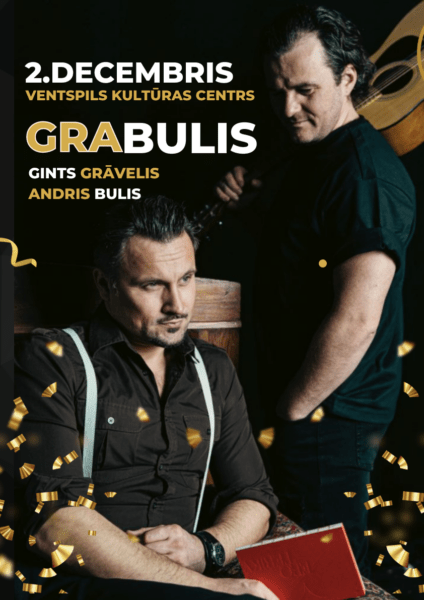 2.decembrī plkst.19:30 Ventspils Kultūras centrā uzstāsies mazlietiņ romantiski, vokāli nelīdzsvarotais, dzejas apreibinātais, Jūsu sirdssiltuma pieradinātais duets GRABULIS (Gints Grāvelis un Andris Bulis).Biļešu cena: 20 EUR