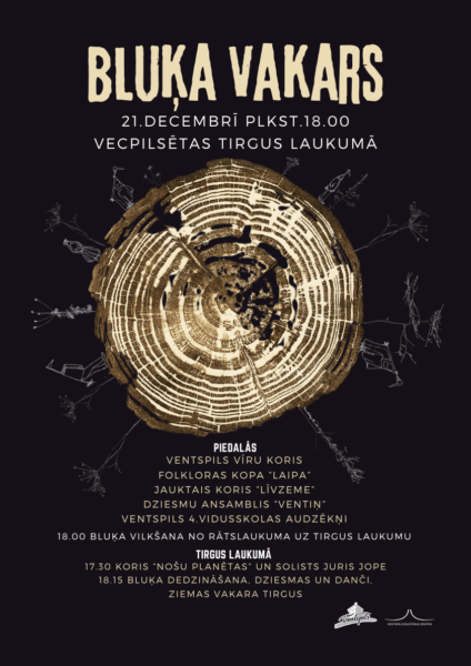 Ceturtdien, 21. decembrī Ventspilī notiks tradicionālais Bluķa vakars. Kopā ar jaukto kori “Līvzeme”, Ventspils vīru kori, folkloras kopu “Laipa”, dziesmu ansambli “Ventiņ” un Ventspils 4. vidusskolas audzēkņiem, visi aicināti pievienoties sentēvu tradīciju rituāliem, dziesmām, dančiem un rotaļām. Plkst. 18.00 bluķa vilkšana sāksies no Rātslaukuma uz Vecpilsētas tirgus laukumu, kur notiks tā dedzināšana – lai sadeg neveiksmes, bailes un viss sliktais. Darbosies arī Ziemas vakara tirgus.