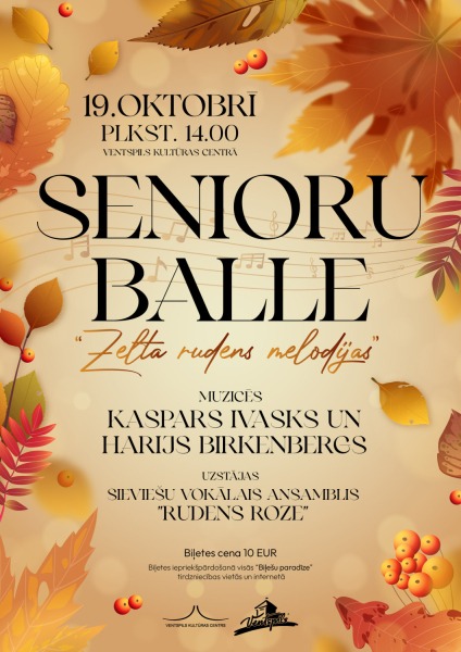 19. oktobrī plkst. 14.00 Ventspils Kultūras centrs aicina seniorus uz balli “Zelta rudens melodijas”, kurā par jautru atmosfēru parūpēsies iecienīti mūziķi.
