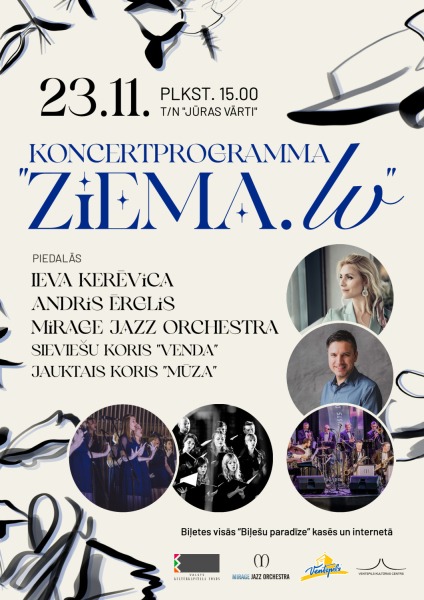 23. novembrī plkst. 15.00 teātra namā “Jūras vārti” izskanēs koncertprogramma “Ziema.lv” – sieviešu kora “Venda” jubilejas ieskaņā. Īpašie viesi būs spožā džeza un populārās mūzikas dziedātāja Ieva Kerēvica un iemīļotais latviešu mūziķis Andris Ērglis, kuru balsis piešķirs koncertam īpašu skanējumu. Uz skatuves kopā ar kori “Venda” un solistiem kāps arī jauktais koris “Mūza” un bigbends “Mirage Jazz Orchestra”.