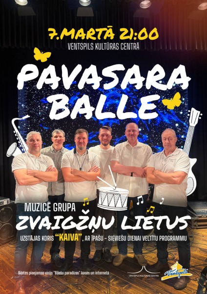 7.martā plkst.21.00 Ventspils Kultūras centrā norisināsies Pavasara balle. Par muzikālo noformējumu rūpēsies grupa “Zvaigžņu lietus”, savukārt īpašu – Starptautiskajai sieviešu dienai veltītu programmu apmeklētājiem dāvinās jauktais koris “Kaiva” (diriģente Ginta Rūse).