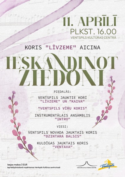 11. aprīlī, plkst. 16:00 Ventspils Kultūras centrā notiks kora “Līvzeme” koncerts “Ieskandinot ziedoni”.