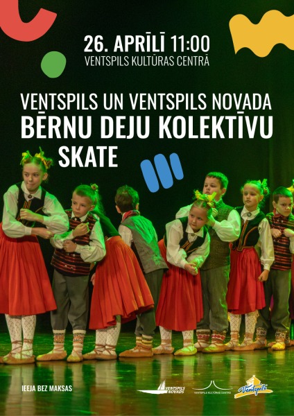 Ventspils Kultūras centrā 26. aprīlī plkst. 11:00 notiks Ventspils Kultūras centra un Ventspils novada bērnu tautas deju kolektīvu skate. Skatē piedalīsies mazie “Liedags” un “Sidrabiņš” dejotāji, kuri ar savu sniegumu priecēs skatītājus un demonstrēs savas deju prasmes.